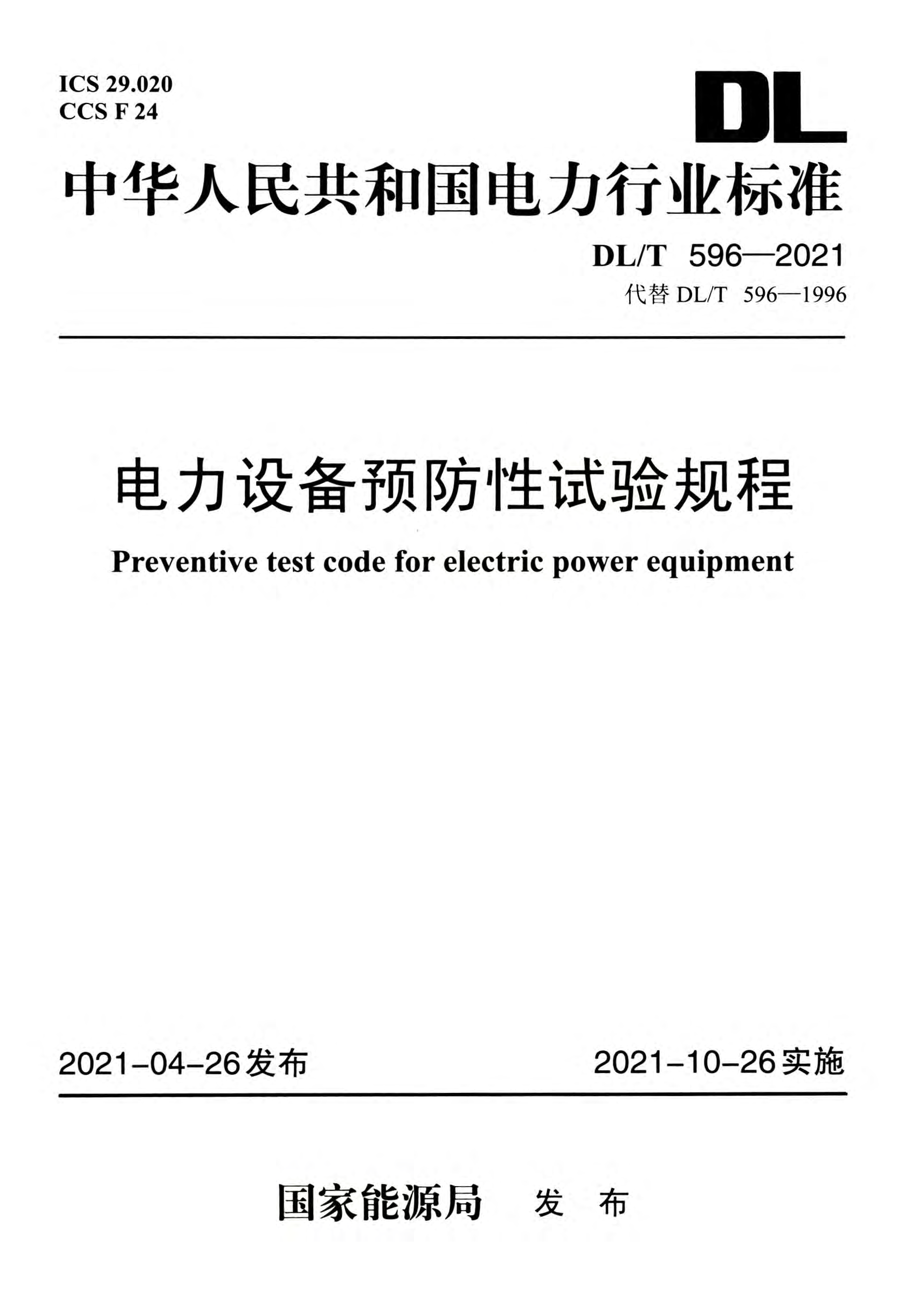 DLT596-2021电力设备预防性试验规程来源:木森运维 本文件按照 GB/T 1 .1一2020《标准化工作导则 第 1部分: 标准化文件的结构和起草规则》的规定起草。 本文件代替DL/TS%一1996《电力设备预防性试验规程》, 与DL/T 596一1996相比,主要技术变化如下: — 增加750kV设备的试验要求; — 增加了串联补偿装置设备、电子式电流互感器、电子式 电压互感器、三相组合式互感器、SF6电流互感器、复 合绝缘电流互感器、电子式电流互感器、复合绝缘子等 设备类型; — 增加电抗器及消弧线圈、并联电容器装置设备章节; — 删除了 “二次回路”章节,有关内容与相关设备合并; — 有关电容式电压互感器中间变压器、祸合电容器和电容 式电压互感器的电容分压器的内容,合并修改为电容式电压互感器; — 增加了在线监测、初值、检修级别等术语和定义; — 增加了设备红外测温、局部放电检测、绕组频率响应分析、SF6分解物测试等新型检测项目; — 依据最新的国标和行标,更新了变压器油、SF6气体等 部分 目的检测方法或判断依据。 请注意本文件的某些内容可能涉及专利。本文件的发布机构 不承担识别专利的责任。 本文件由中国电力企业联合会提出。